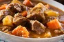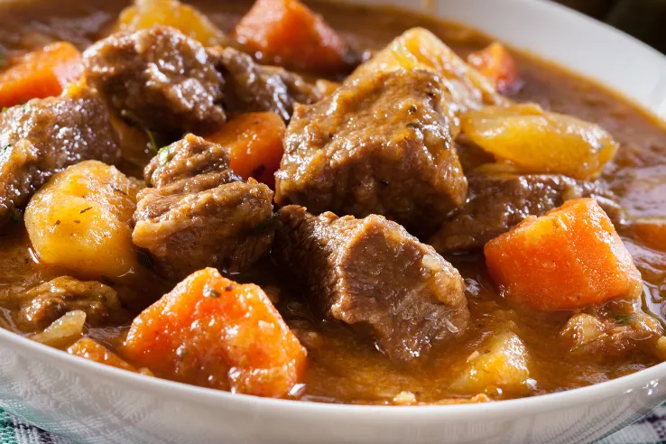 Enjoy comforting stew featuring chunks of beef with potato and veggies in a thick sauce.